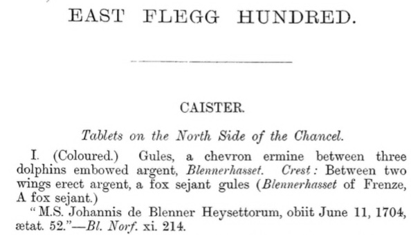 An ancient canvas wall hanging, painted with the arms of Blennerhassett and their intermarriages in Norfolk & Suffolk, was seen "surrounding two rooms" at a house at Caister-on-Sea, near Yarmouth, Norfolk by Francis Blomefield when gathering material for his "History of Norfolk" est. c1745.