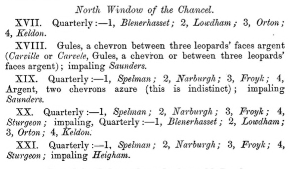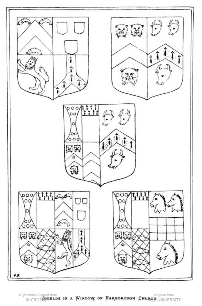 [Church Heraldry of Norfolk, Rev. Edmund Farrar, v.1 1887, Narborough pp.82-83]