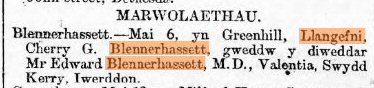 Dr Edward Blennerhassett died at Knight's Town, Valentia 28-Mar-1874. His widow Cherry Blennerhassett subsequently removed with her three children to Wales, residing in 1881 at a lodging house in Caradog Place, Llanfair Fechan, Carnarvonshire with her brother-in-law William Blennerhassett (formerly of Laharan, Valentia). In 1891-1893 Cherry lived at 4 Pensallt Street, Bangor, Carnarvonshire; in 1889-1898 at Green Hill (Greenhill), Llangefni, Anglesey, North Wales where Cherry died on 6-May-1898.