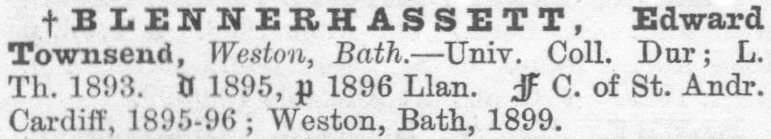 NOTE: Rev. Edward Townsend Blennerhassett is mentioned at St Fagan's parish, Cardiff in a directory of 1897