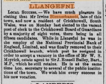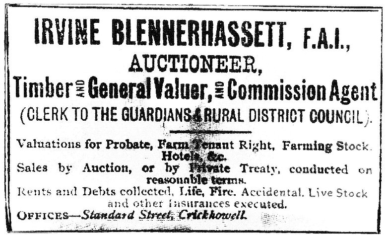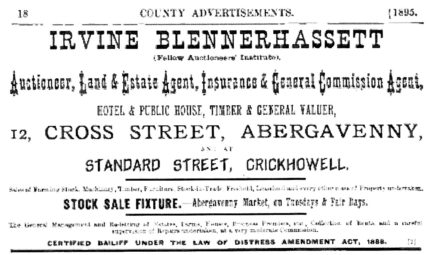 In 1881 Irvine was a Classics Teacher, fluent in English & Welsh, living with his widowed mother, siblings and uncle William Blennerhassett at Llanfair Fechan. The family removed to Llangefni (county town of Anglesey) where Irvine worked as bank clerk for the National Provincial Bank of England. At some date before 1885 he transferred to Crickhowell branch of the NPB, from "...which post he resigned in order to accept a vacancy in the office of Mr W. S. Mayrick, estate agent to Sir J. Russell Bailey, Bart., M.P.". Building on this, Irvine set up business as Accountant, Auctioneer, Valuer, Land & Estate Agent & Insurance Agent at Standard Street, Crickhowell, also at 12 Cross Street, Abergavenny (an hotel & public house).