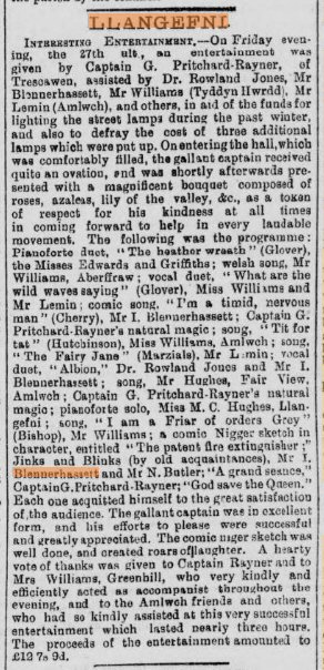 Irvine Blennerhassett sings at Llangefni 27-Apr-1888