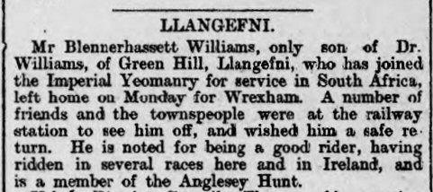 Dr Williams of Green Hill, Llangefni, Anglesey, North Wales had an only son named Blennerhassett Williams,